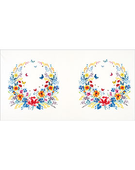 水彩画風にプリントされたフラワーリースの布です。中央の部分にアップリケやイニシャルなどの刺しゅうを入れるだけでオリジナル作品に。まわりにボーダーをつけてタペストリーに仕立てたり、クッションやパネルにして飾っても素敵です。1パネルで2個入っています。