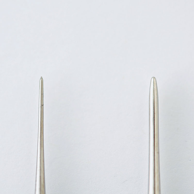 針の名産地、広島で丹精込めて作られた目打ちです。 小さな穴開けや糸をほどくのに便利な、先端が細く鋭い極細タイプと、角をのばす時や綿をつめる時にも生地を傷つけない先丸タイプの2本セット。 握りやすく滑りにくいクッショングリップです。