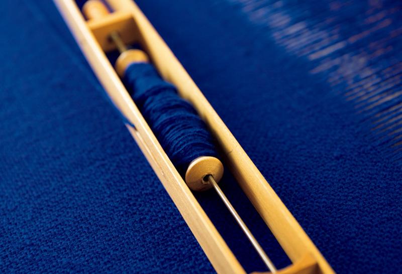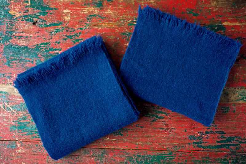 ブルーの宝石のような色。これは同じ原毛を使って平織(右)と杉綾織に織り分けた。織り方によって、微妙に光の当たり方が変わる。カシミヤだから発色がいいという。