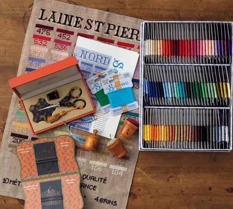 色鮮やかな糸巻きは、サジューの代表的な刺しゅう糸「Retors du Nord」。96色のコンプリートBOXにはカラーチャート図案がついています。鼈甲のはさみセットは糸巻きとシンブルつきの箱入りで、プレゼントにもぴったり。