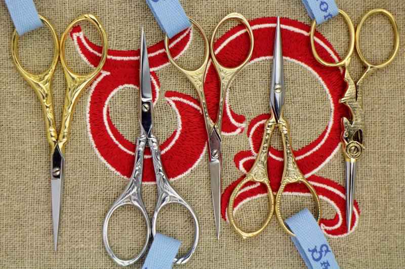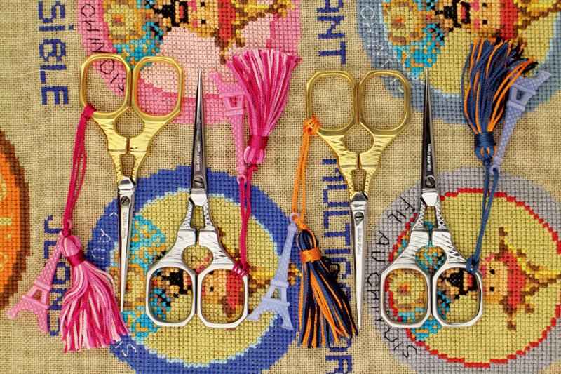 (上)有名なエッフェル塔の刺しゅうはさみ。クロムまたは金メッキ製。すべてエッフェル塔の飾りがついています。 (下)フランスの伝統的な刺しゅうはさみの復刻品。