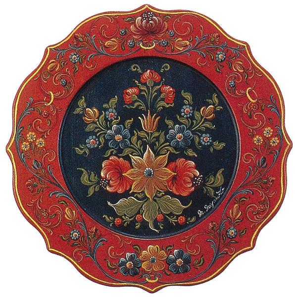 ヒンデローペンの伝統的な装飾ペイントは、地色が、赤、紺、緑のどれかであるのが特徴です。豪華に見せるために、華やかな地色をつけたり、高価な彫刻を模した模様をつけるようになったといわています。いずれも重厚な色合いで、花やツルなどの植物をパターン化した模様が描かれます。贅沢なものには風景画などが組み合わされました。
