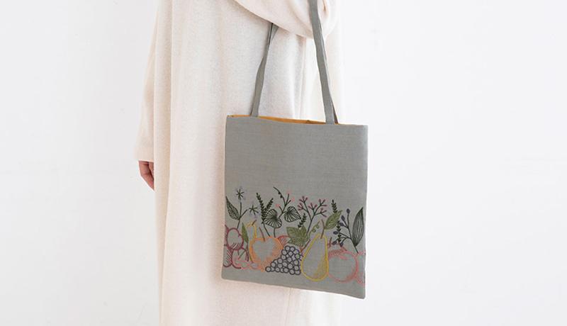 線刺しで描かれるカラフルな果実たち。自然界からのギフト、香り立つフルーツをたっぷりと刺しゅうするバッグです。25番刺しゅう糸のみで大人っぽく上品に仕上げます。