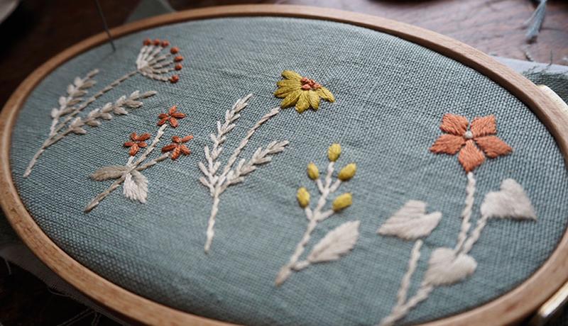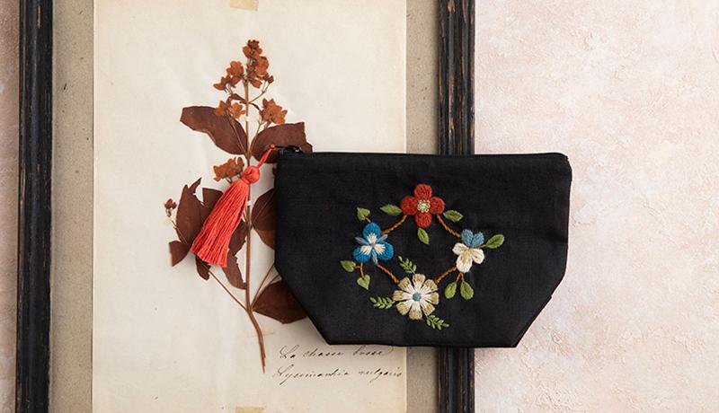 ウール糸を使って、野に咲く小さな草花のモチーフをポーチにあしらいました。お花はウールでふっくらと立体感のある仕上がりに、葉と茎は25番刺しゅう糸でシャープに。裏面のデザインは表の花のつぼみをイメージしています。25番刺しゅう糸で作るタッセルを付けて、少しおめかししてみました。