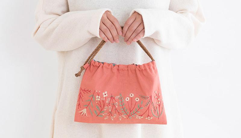 お出かけが楽しくなる美しい巾着バッグ。コーラルピンクのリネンにリズミカルな植物模様を刺しゅうします。生成り、ピンク、グリーンの3色のみの刺しゅうで、大人っぽい仕上がりに。ひもをバッグの片方で結びとめる巾着型は、持ちやすく使いやすい形です。