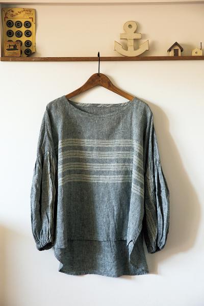 『今日の大人服』(日本ヴォーグ社)の表紙を飾ったバルーンスリーブブラウス。使用した布はリトアニアリネンのミックスボーダーで、これもMay Meオリジナル。