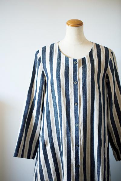 ストライプづかいが印象的なコートワンピース。「ストールを巻いたり、前を開けてそのまま羽織ったり。いろいろな着こなしが楽しめるよう、シンプルに仕立てました」