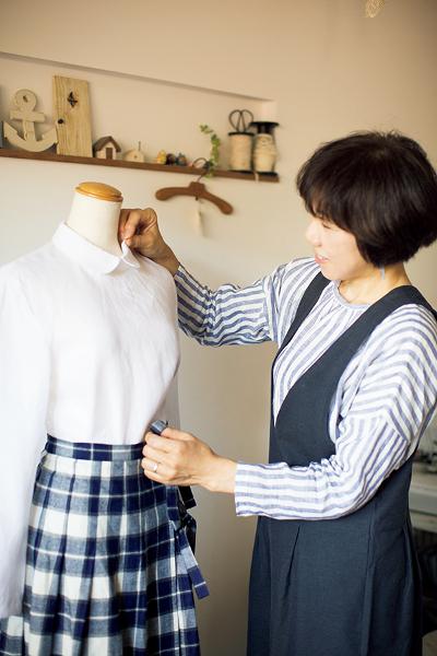 「小ぶりな衿が好き」という伊藤さん。新作のデザインを考えるときは、まずは自分に似合う服や着たい服を頭に思い浮かべ、そこからイメージを膨らませていくそう。「街行く人を観察したり、テレビドラマを見たりするのも好き。その時々の流行がわかるし、どの年代の人がどんな服装をしているのか、客観的に見ることができるので参考になります」