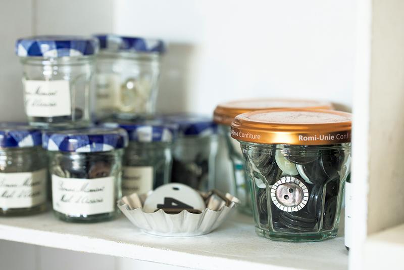 ボタンなどの細かなパーツは、ジャムの空き瓶に種類別にストック。