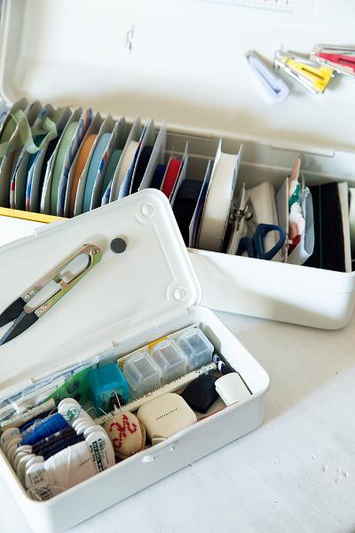 スチール製の工具箱をソーイングボックスとして愛用している。ふたの裏側にマグネットで針やツール類がとめられてとても便利。手前はボタンつけなど、手縫いで作業をするときに使用するセット。大きなケースには接着テープとテープメーカーを収納している。