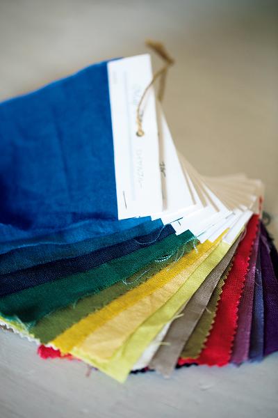 色数豊富なカラーリネンを愛用している。お客さまからのオーダー用に生地サンプルを用意し、ニーズに合わせて定番服のアレンジにも対応する。