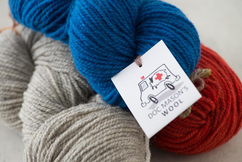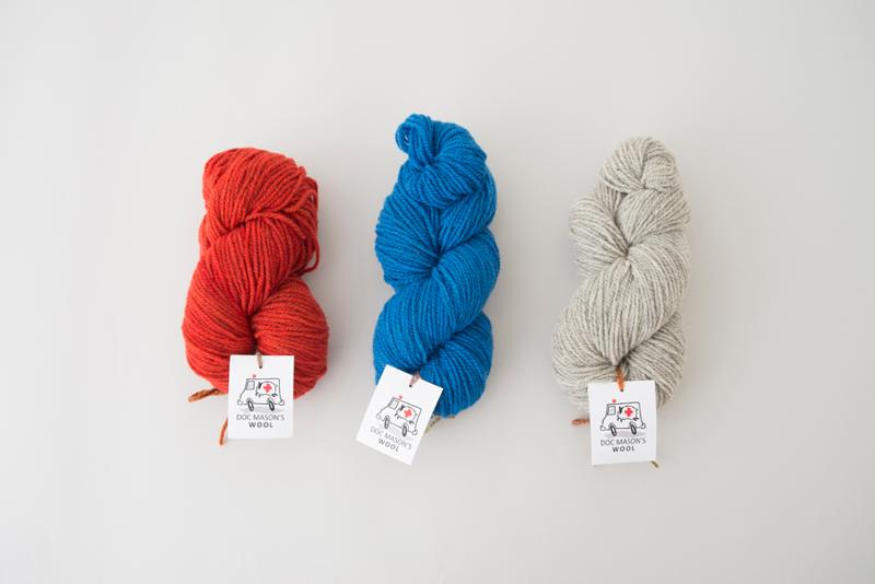 翌年ドック・メイスンは羊毛を工場に送るとき、エレンにブランケットでなく毛糸が欲しいか尋ねました。初めは羊毛の提供と交換で、すでに工場にある糸を受け取るものでしたが、ドック・メイスンの羊は少しずつ増え、やがて自前の羊毛を混ぜた糸の紡績を工場に依頼できるようになっていきました。そして2015年の夏、エレンはドック・メイスンの羊のウールが3分の2以上含まれた数百カセの糸を受け取りました。この糸にDOCMASON'S WOOLと名付けて、かわいいラベルを作り、販売を開始したのです。