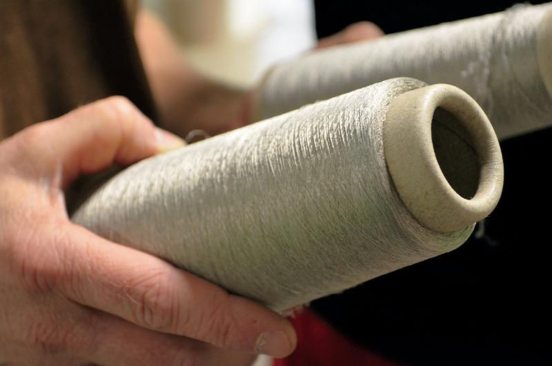 どの糸もコットンと銀の糸というイメージからは想像できないような、驚くような軽さと、手触りのよさを兼ね備えています。カラーバリエーションは、現在ではすべて草木染で作られるようになりました。一見してナチュラルな色合いの糸には、実は高度な先端技術と古来の染色が溶け合っています。