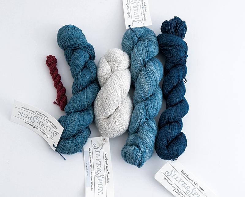 Feel Good Yarnの最初の糸SilverSpun®Sportは、丹念に梳いたコットン87%、ナイロン5%、3%のスパンデックスに、シルバーが5%含まれています。スパンデックスがコットンの糸に伸縮性を持たせ、シルバーがバクテリアによる臭いを抑える作用を持っています。さらにシルバー素材の持つ伝導性のおかげで、スマートフォンなどのタッチスクリーンに使用できる手袋を編むこともできます。この糸は靴下や手袋などの小物にとても適した特質を備えているのです。Sportsのほか、同じ組成でもう少し細いSockがありますが、SilverSpun®Silkという、スパンデックスを含まず、17%のシルクを混ぜた、ショール向きの糸も生まれました。