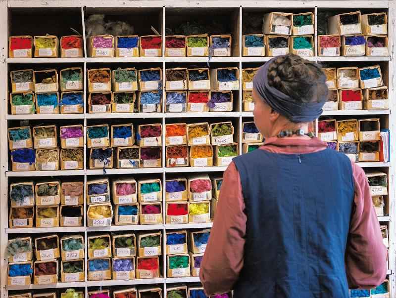 この糸は、アイルランド北西部の歴史ある紡績所ドネゴール・ヤーンで製造されています。19世紀初頭から続く歴史を持つこの紡績所の糸は「ほかのどんな糸にも似ていない」とケイトは言います。ここで作られる糸はすべて、伝統的な紡毛のツイード糸なのです。ここの糸は、糸の形になってから染めるのではなく、ウールファイバーの段階で染色されます。染まったウールに、さらにウール100% の様々な色合いのネップが「ブレンディング・ルーム」で梳すきこまれ、混ぜ合わされます。ファイバーの状態で色を混ぜ合わせたウールが紡績されることで、生み出されてくる色に、複雑な奥行きと深みが現れます。