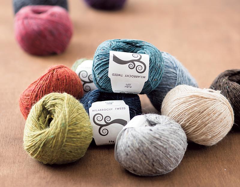 彼女の最初の糸ブーフユは、スコットランドで生まれ育ったローカルな羊のウール100%から作られた並太糸でした。彼女自身のさまざまなデザインを支える使いやすい糸として、ファンに愛され続けています。かわってこの冬新しく発表になったばかりの糸は、がらりと雰囲気の違う繊細な風合いのツイード糸、Milarrochy Tweed(ミローキ・ツイード)です。