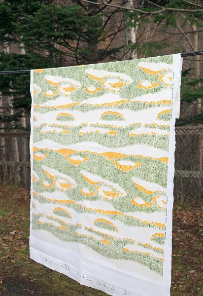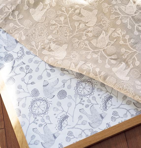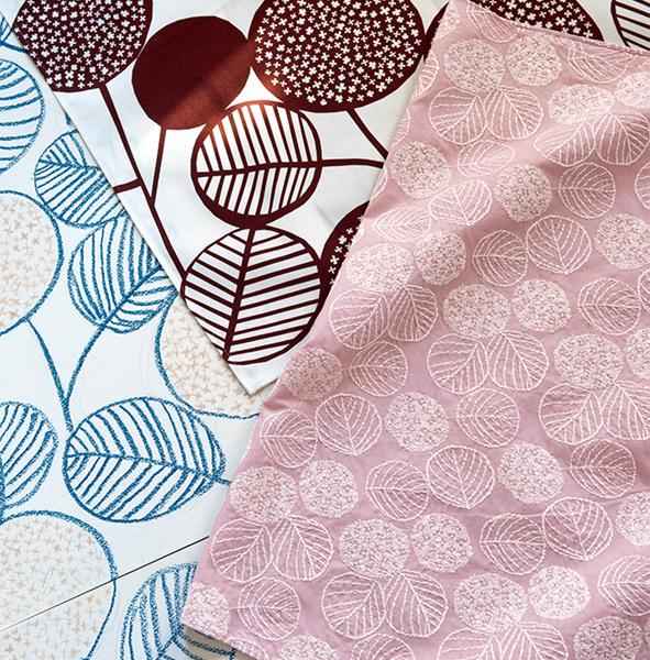 「bird-garden」の原画と麻布に刺しゅうした生地。プリント生地から刺しゅうに起こし直したもの。