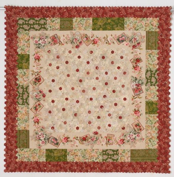 主役のポストカードを、ピースワークやアップリケの技法を使って引き立つようにデザイン。中央のヘキサゴンから配色をして、それらを取り囲むように3種類のボーダーをアレンジしました。