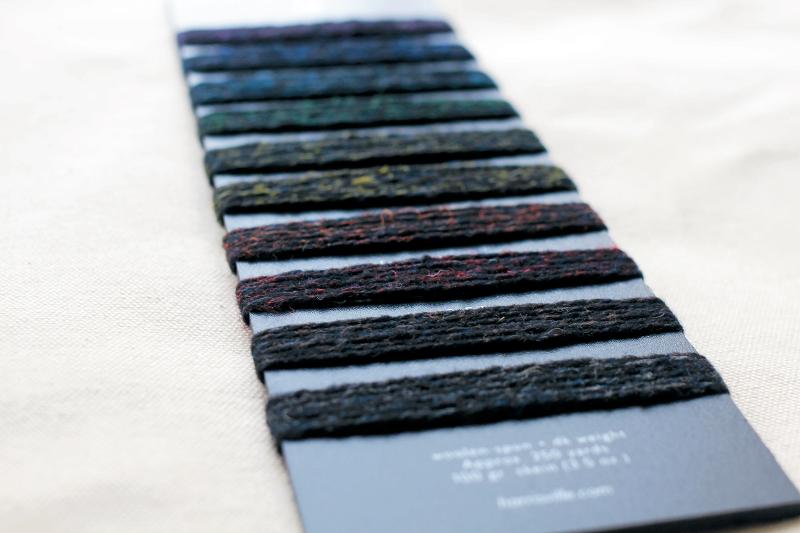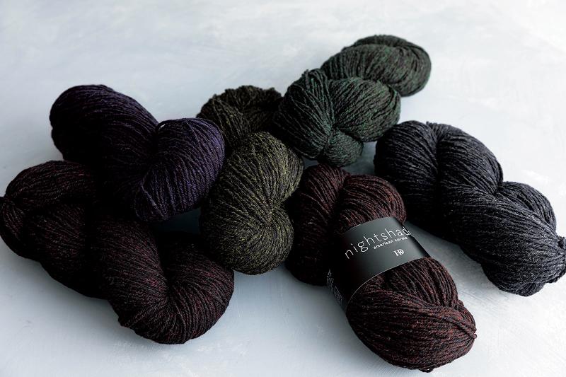 同社では、昔ながらの紡毛糸であるロングセラー糸Highlandのほか、近年はBTの糸によく似たツイードのf lyWheel、WATERsheedといった糸をオリジナルで作っていますが、2018年秋、この不思議な糸nightshadesを発表しました。コルモウールを贅沢に使用しつつこの白い羊毛を真っ黒に染めてわずかに色を足し、黒の中に微妙な色のトーンを10色作り出しているのです。全10色すべてがほぼ黒、という大胆なラインナップに驚かされます。