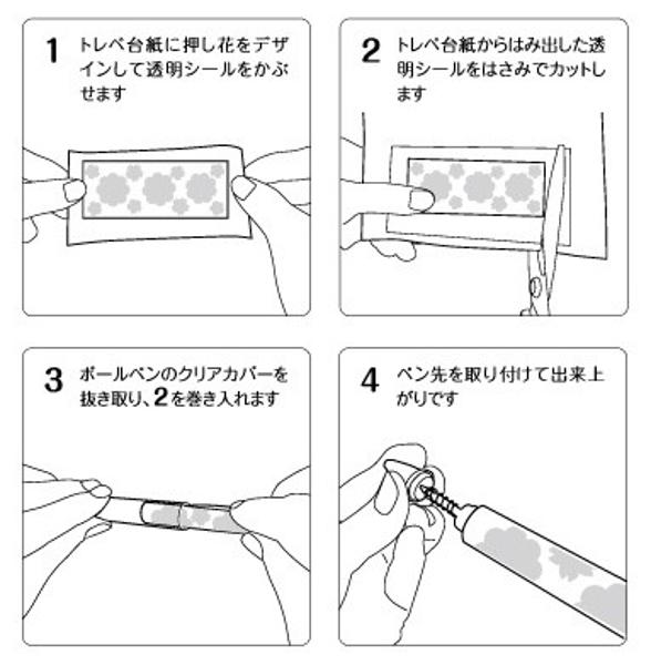 セットされている台紙に付属の押し花を並べて、透明シールをかぶせるだけで、世界で一つだけのボールペンの出来上がりです。