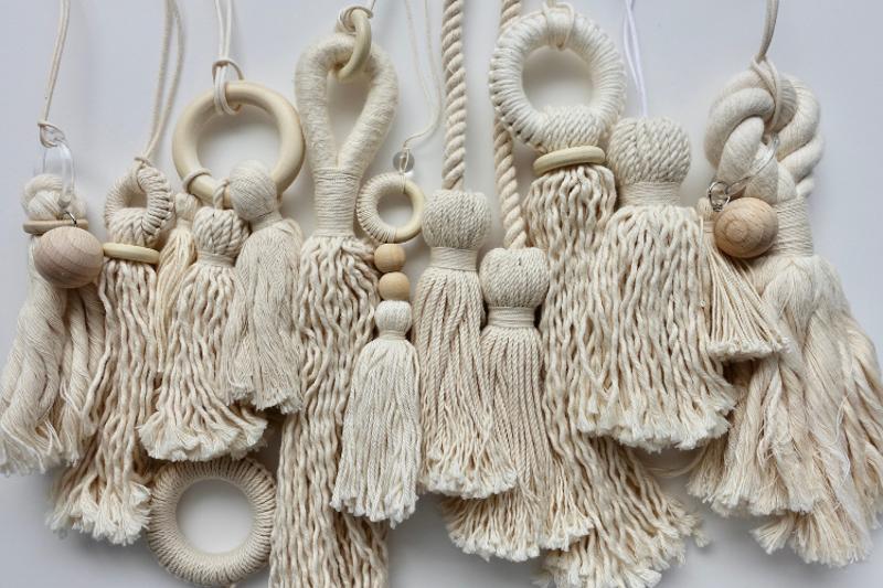 太さの異なるより糸や太い綿ロープなどのそれぞれの特性を生かし、木球やウッドリングを組み合わせてデザインされたタッセルは、まるで芸術作品のよう。