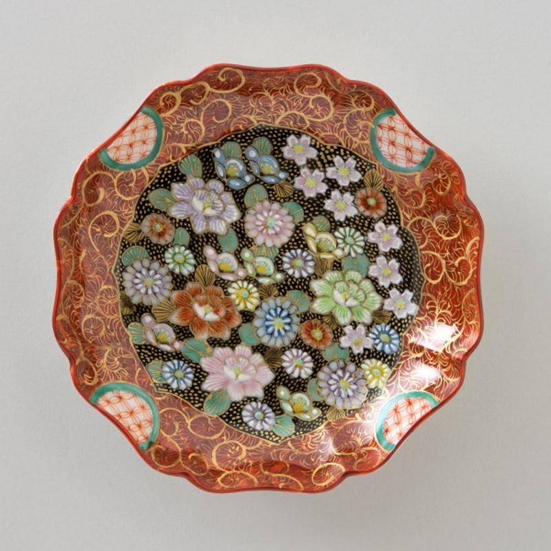 「九谷焼 色絵金襴手」の中級課題作品。花を描き詰める“花詰(はなづめ)”や金の点描“金粒(きんちぶ)”の技法を学びます。