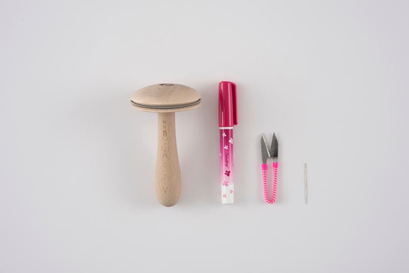 使う道具はダーニングマッシュルーム、仮止めのり、糸切りはさみ、針。仮止めのりは当て布を使う時の仮止めに便利。