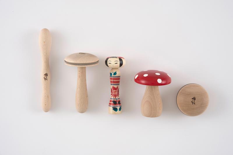 野口さんオリジナルデザインのダーニングマッシュルーム。左から、靴下や手袋の指に適したダーニングスティック、小さい部分を修繕しやすいダーニングこけし、一般的に広く使えるダーニングマッシュルーム(止めバネタイプ)、水玉模様がかわいい立ち型タイプ、ポケット部分に便利なダーニングマカロン。すべて日本製。