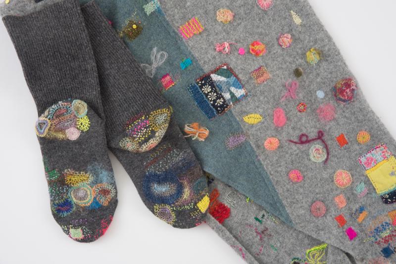 ダーニングしたウールのマフラーと靴下。ステッチや素材を変えたり、また上や下からあて布をしたりするなどして作った、まさにダーニングのサンプラーです。