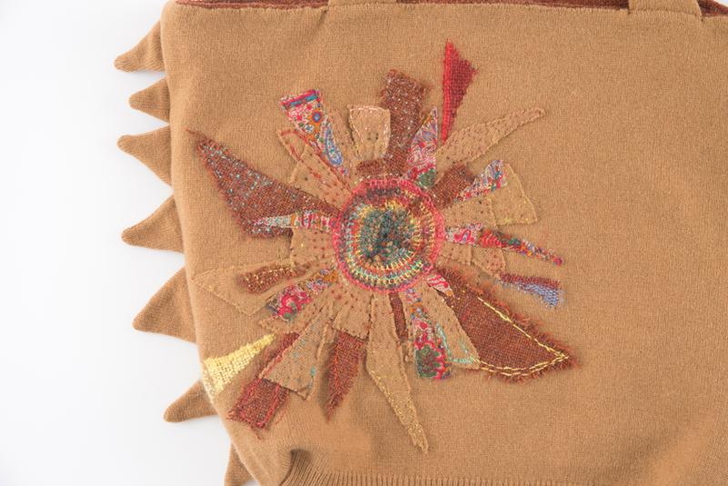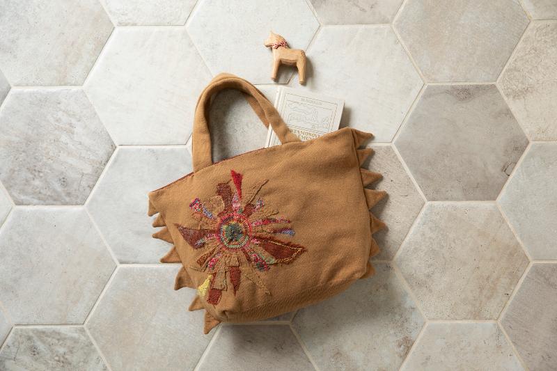 カシミアのカーディガンを解体して作ったバッグ。カットした三角形のあて布をのせて、ダーニングのステッチで自由に刺していきます。両脇にとび出た三角形のモチーフがユニーク。