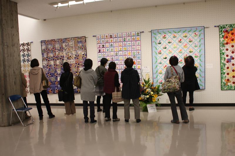 教室では、生徒さん一人ひとりの使いたい布や好きな色を尊重して指導することを心がけているそうで、優しい色から元気な色、そしてテクニックはアップリケ、刺しゅう、ピースワークなど、どの作品も個性が発揮されています。期間中はキルトポット店内でセールが開催され賑わいました。
