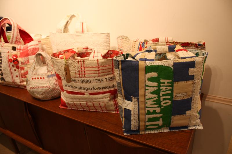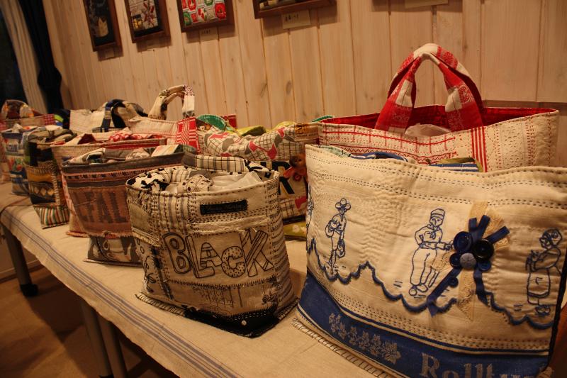 藤村さんは、コロナ禍で家で過ごす時間が多い時に、今まで大切にしていたリネンやコットン、シャツなどの布を使ってたくさんのバッグを作りました。仕立て以外はすべて手縫いでチクチク縫ったそうです。素敵にコラージュされた、1点1点異なるバッグが会場いっぱいに並べられ、使いやすいシンプルな形と手づくりならではのぬくもりの感じられるバッグに来場者は魅了され、売約済のバッグも多くありました。