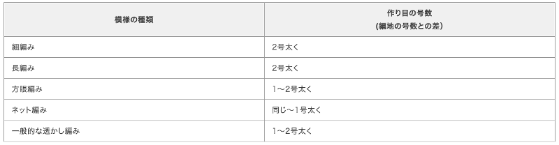 作り目は、編地の種類によってかぎ針の号数を1号から2号太くします。