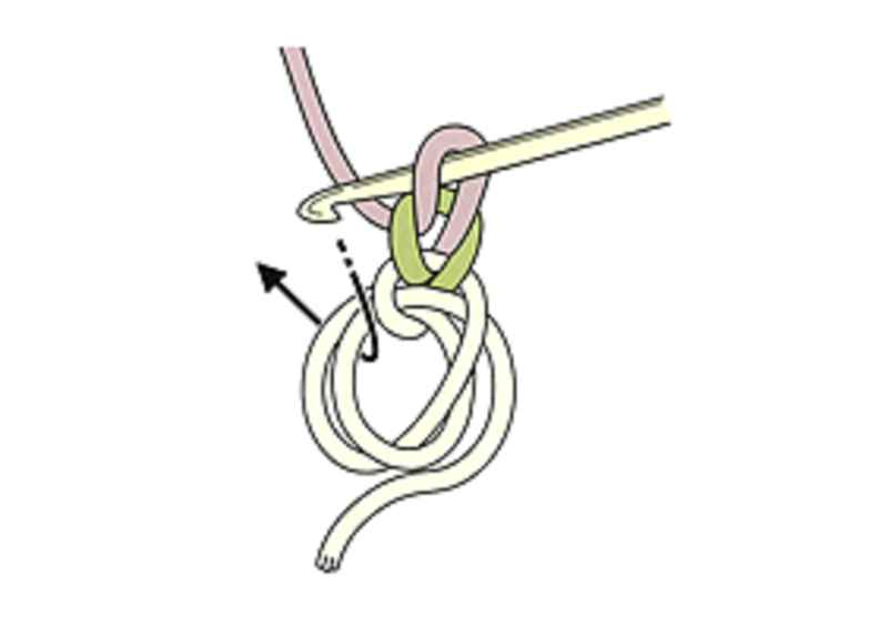 ①かぎ針を糸の向こう側にあてて、矢印のようにかぎ針を一回転させ、糸を巻きつけます。