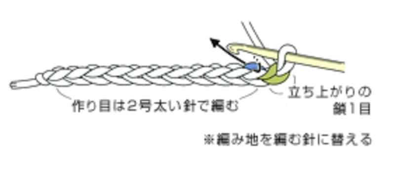 ①編み始めは、鎖編みの作り目を編み、立ち上がりの鎖を1目編みます。