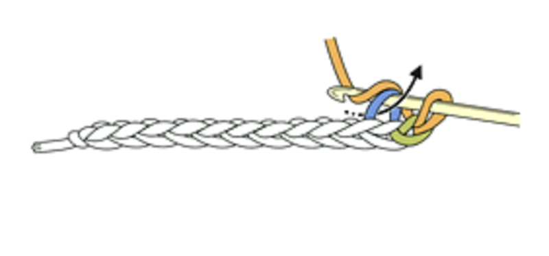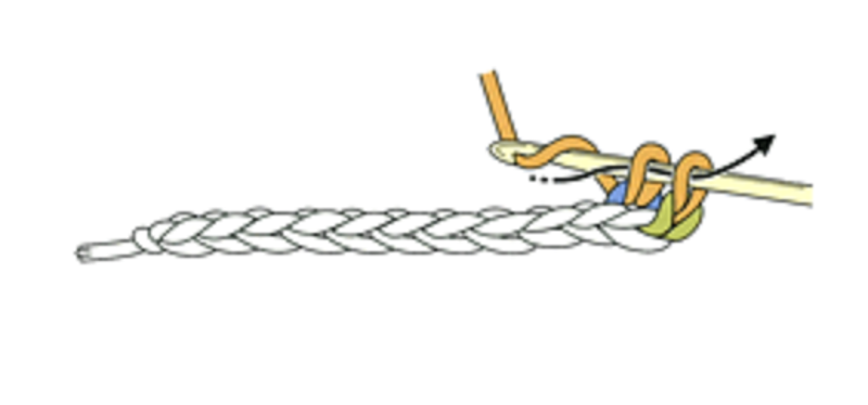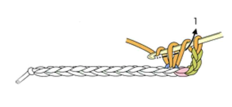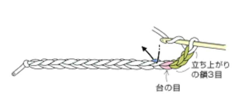 ①編み始めは、鎖編みの作り目を編み、立ち上がりの鎖を3目編みます。