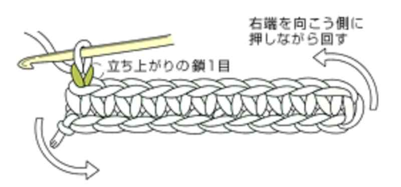 ⑤編み終わりは、立ち上がりの鎖を1目編んだら、矢印の向きに回して編地を持ち替えます。