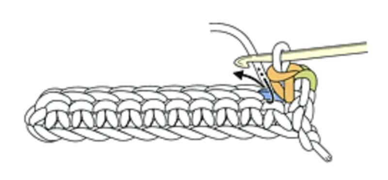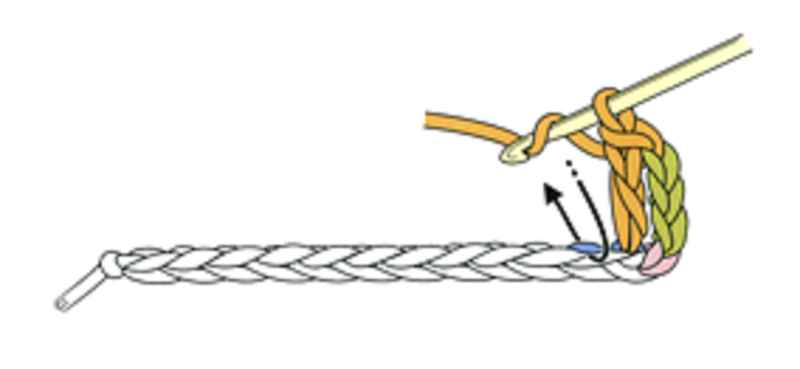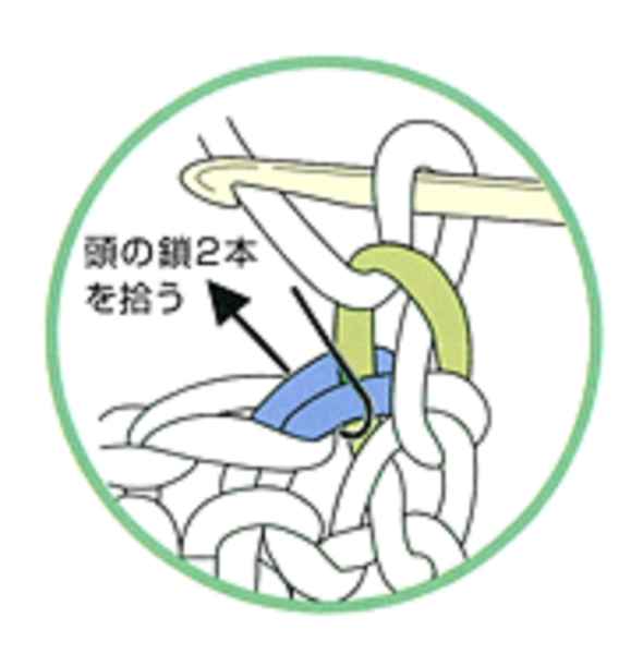 ⑥2段目は前段端の頭の鎖2本を拾い細編みを編みます。
