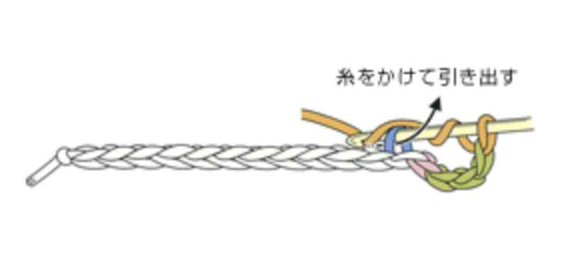 ②作り目の1目目の裏山にかぎ針を入れ、糸をかけて引き出します。