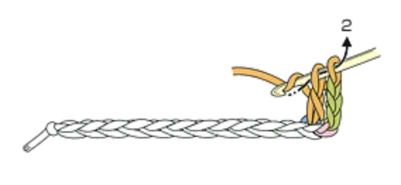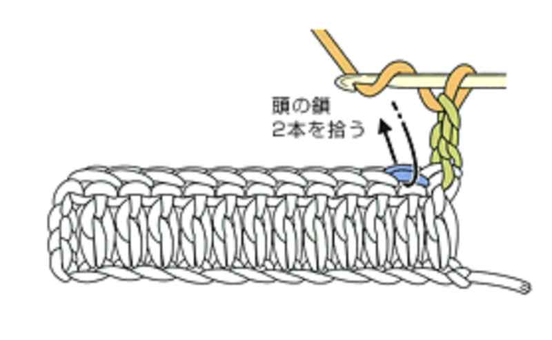 ⑧2段目は前段端の頭の鎖2本を拾い長編みを編みます。