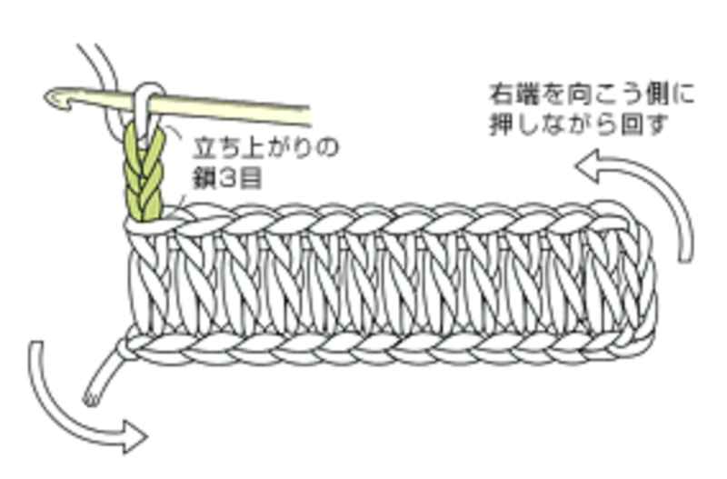 ⑦編み終わりは、立ち上がりの鎖を3目編んだら、矢印の向きに回して編地を持ち替えます。