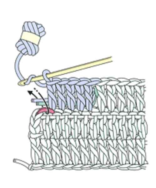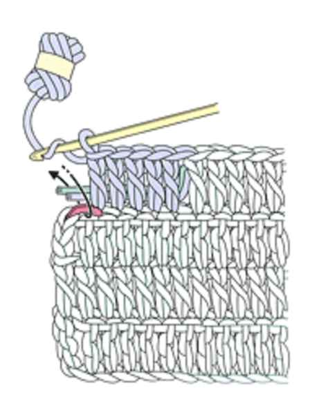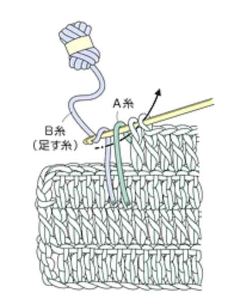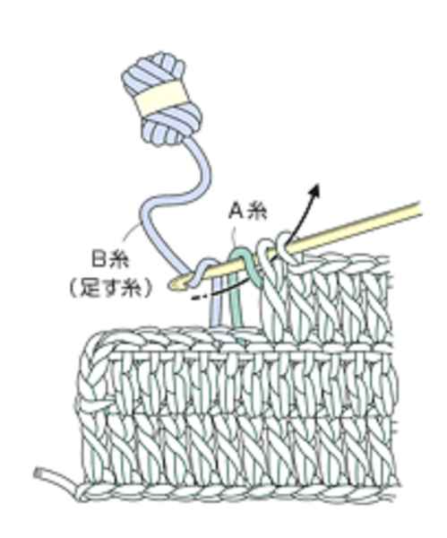 端の目の最後の引き抜きで、針の手前から向こう側に糸をかけて、足す糸で編みます。