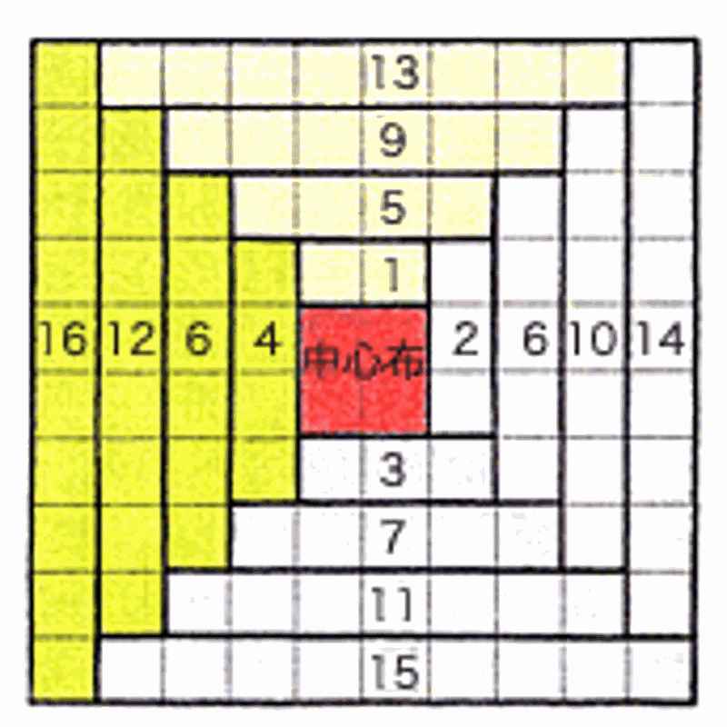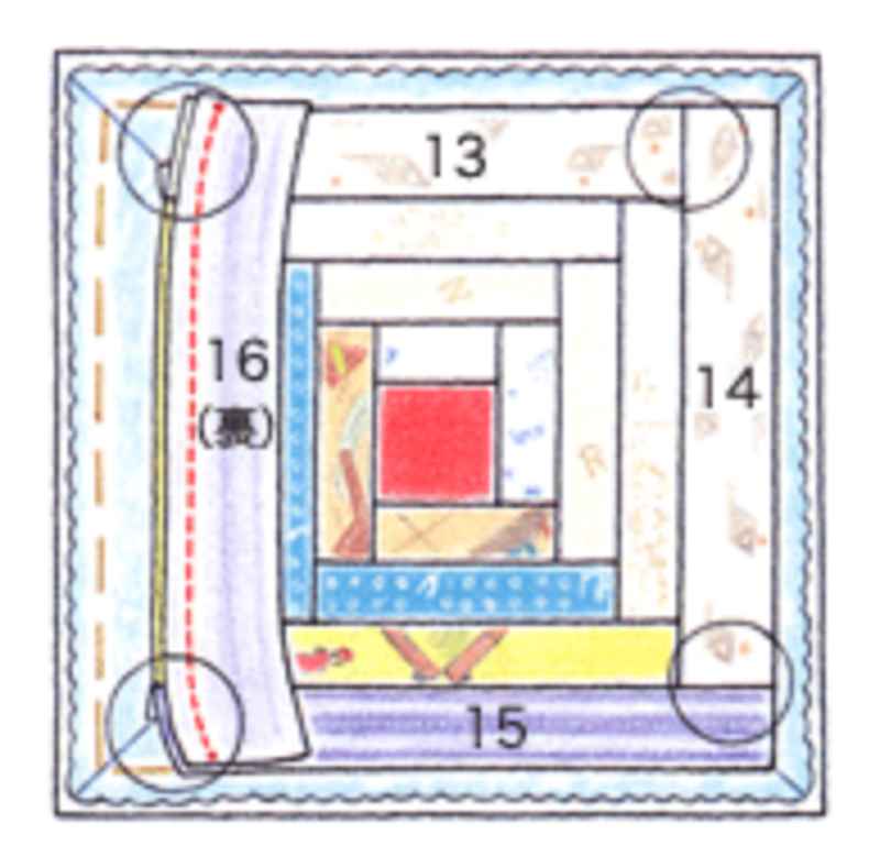 ⑤同様に番号順に縫いつけます。最終段の四隅は表布どうしで縫い合わせ、裏布とキルト綿には縫いつけません。1つのブロックの完成です。