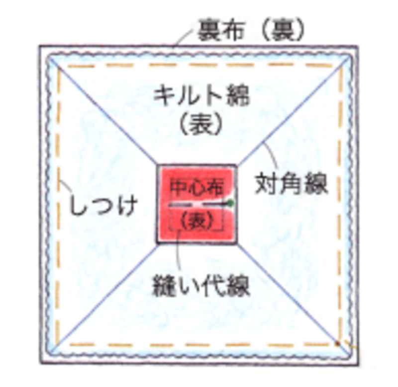 ①キルト綿に鉛筆で対角線を引き、裏布と合わせて周りにしつけをかけます。中心布の表に縫い線を描き、キルト綿の中心に置いてまち針で止めます。