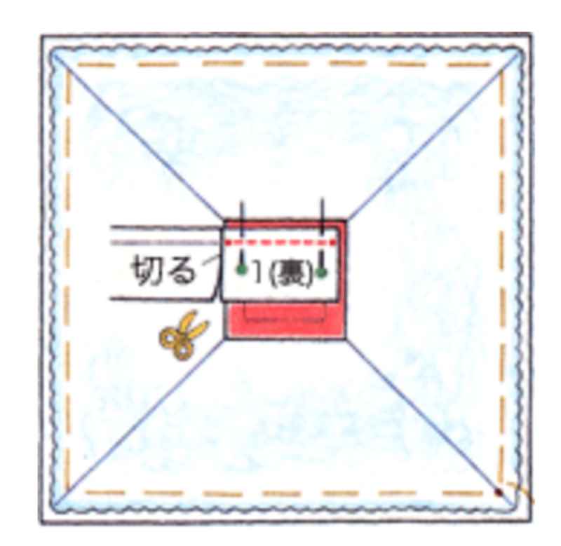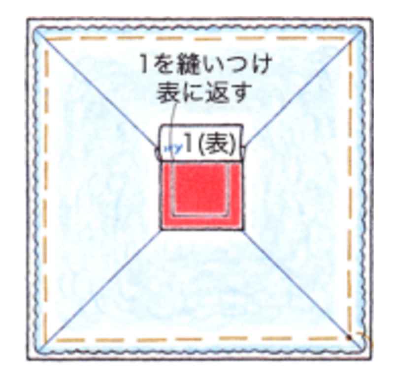 ③中心布に1の布を縫いつけ終わったら、1の布を表に返します。