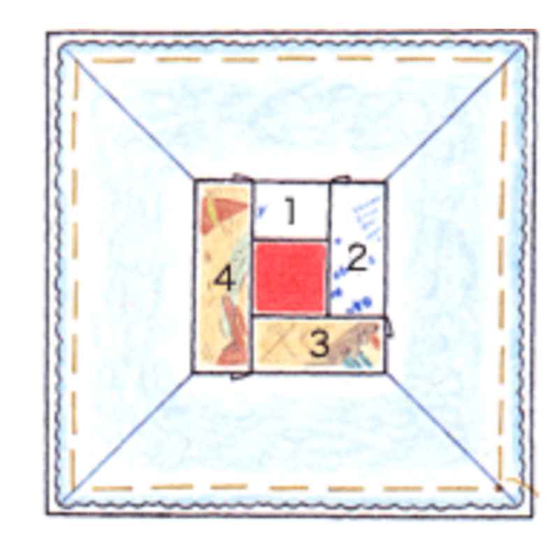 ④2、3、4の布を順番に縫いつけ、表に返します。裏布とキルト綿も一緒に縫うので、この方法はキルティングの必要がありません。対角線上にでき上がっていく正方形のコーナーがずれていないかどうか確認しながら縫いましょう。