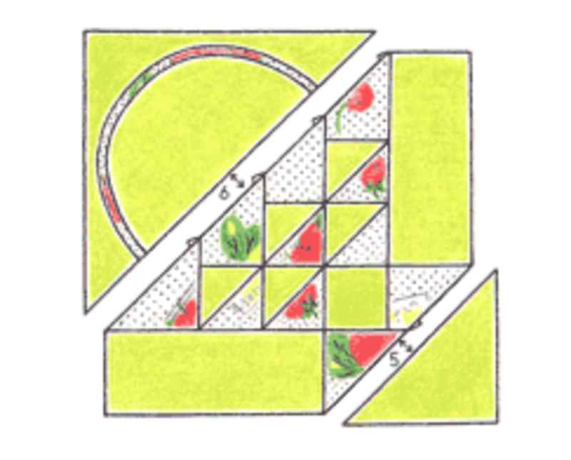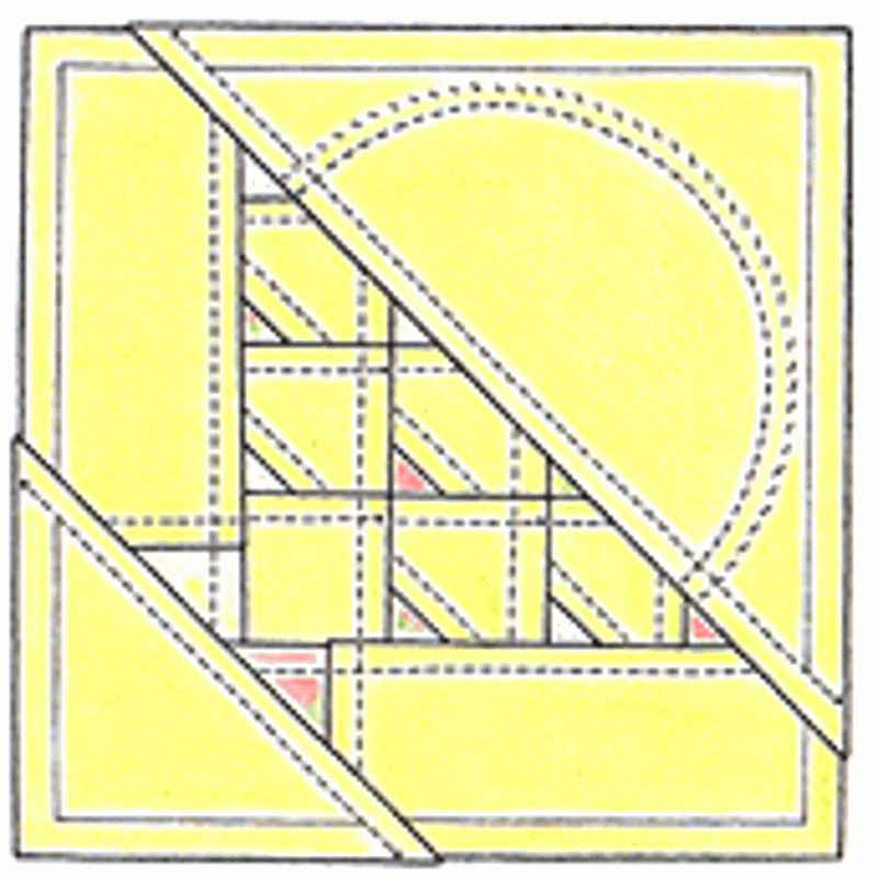 ①図の1~6の番号順に縫い合わせ、グリーンの矢印の方向に縫い代を倒します。縫い代は原則として濃い布の方に倒しますが、状況に合わせて目立たせたい布の方に倒すことがあります。