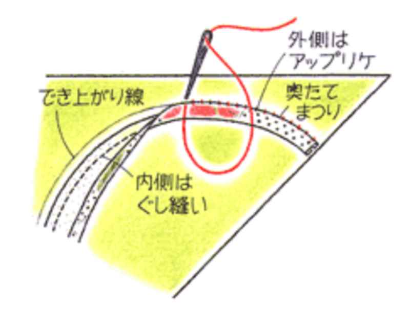 ②6を縫う前に、持ち手をつけます。持ち手のでき上がり線に印をつけ、内側はぐし縫い、外側はアップリケをします。