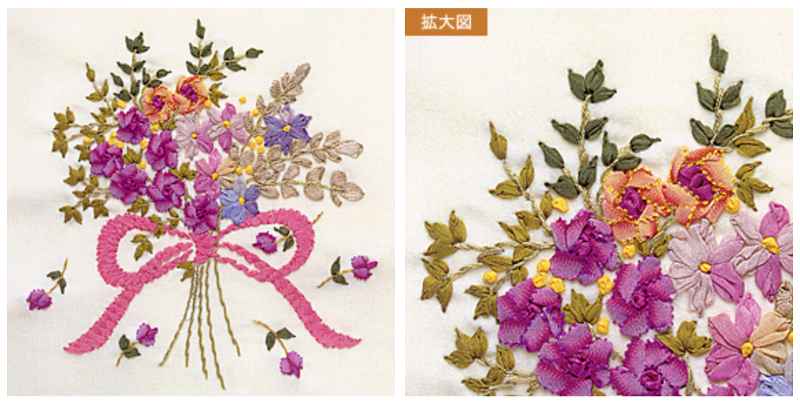 18~19世紀の西欧、華やかにまとった貴婦人の衣装には、美しいリボン刺しゅうが施されていました。イタリアのボローニアにはじまったリボンの歴史は、1517年フランスのリヨンの南西、サンデチエンヌにその中心を移し、以後たくさんのリボンが生産されました。リボンにはいろいろな種類があります。ステッチの針運びは刺しゅう糸と同じですが、幅があるので、引き加減に注意して刺します。