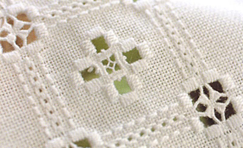 ハーダンガー刺しゅうは、ノルウェーのハンダンゲル(Hardanger)地方の女性たちの間でつくり出されたもので、格子ドロンワークの一種です。クロスターブロックを使うのが特徴で、小さなブロックにサテン・ステッチを刺し、糸を抜いて四角形の格子を残します。残った織り糸を、かがったり、織ったりして、バーの形をつくり、四角形の空間には、いろいろな種類のフィリング・ステッチが入ります。図案はおもに幾何学模様になります。
